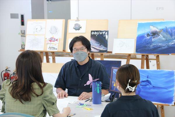 関いい質問ですね。今は、インターネットなどで画像を検索できますが、何が大事かというと、やはり絵は写真や画像とは違うものである、ということだと思います。絵は、良いアングルによって、写真よりさらに強烈でインパクトのある一瞬をとらえるよう、考えて表現しなければならないと思っています。あとは、小さい頃からの知識や経験がすごく役に立っていて、水と触れ合ったり、泳いだり、ダイビングをして水中で過ごしたり、船の上で波を見たり、そのような海との関わりがあることで、イメージしやすいのかなと考えています。