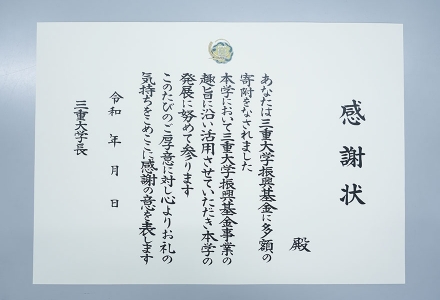 三重大学ではご寄附いただきました方々に、寄附金額に応じた以下の特典をご用意させていただきます。