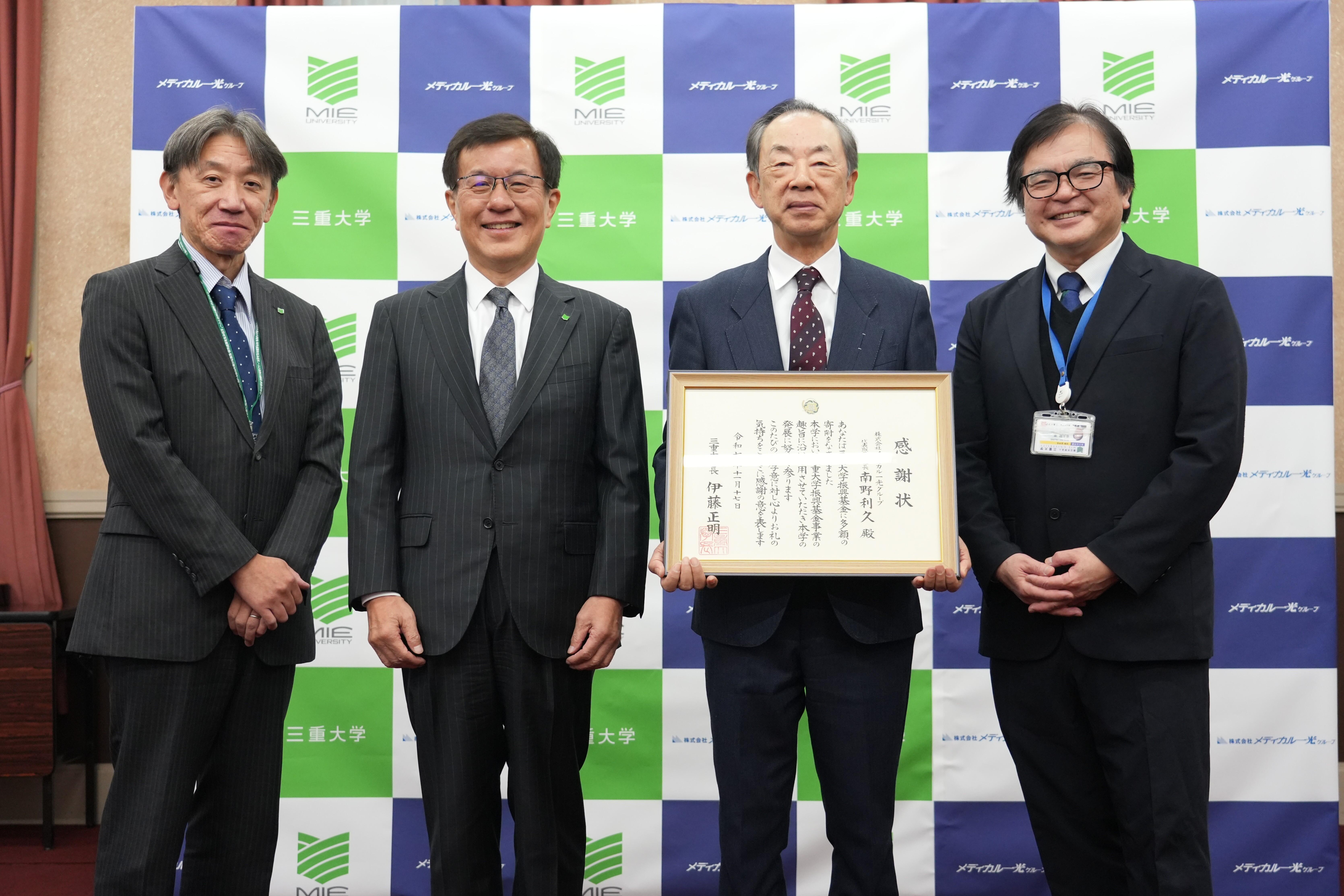 11月17日(月)、三重大学三翠会館にて、三重大学振興基金へご寄附を賜りました株式会社メディカル一光グループ様に、感謝状を贈呈いたしました。