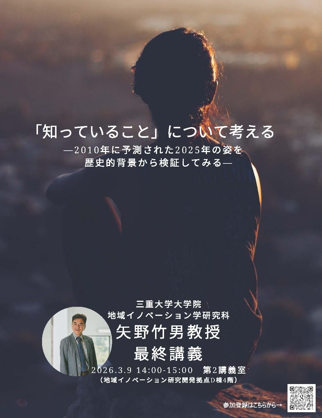 さて、三重大学大学院地域イノベーション学研究科開設以来、本研究科において教育および研究に長らくご貢献をいただきました矢野竹男先生は、令和8年3月末日をもちまして定年退職される予定です。