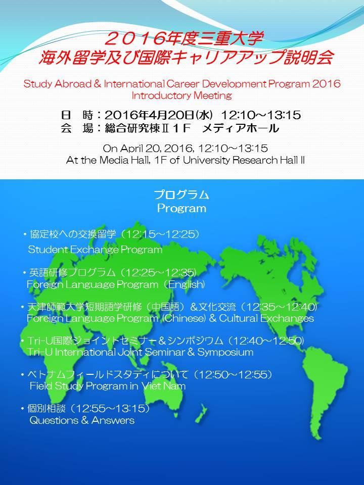 2016年度 海外留学及び国際キャリアアップ説明会が開催されます‼海外留学に関心のある皆さん、この機会にぜひご参加下さい。事前予約不要です。直接会場へお越しください。