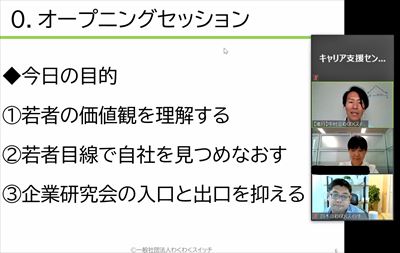 新型コロナウイルスの影響でオンライン上での集合研修という形で実施し、16社の企業様に参加していただきました。また、ゲストとして現役大学生6名も参加しました。