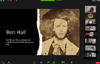 はじめに、お互いの大学紹介からスタート。平賀さんが忍者研究や環境学を含めた本学の研究や教育の特色、そして三重県の海女文化や観光名所、グルメを紹介。続いてBenさんが、UTASの美しいキャンパスと共に、19世紀のオーストラリアで全盛期を迎えていた盗賊集団(Bushrangers)の歴史について紹介してくれました。