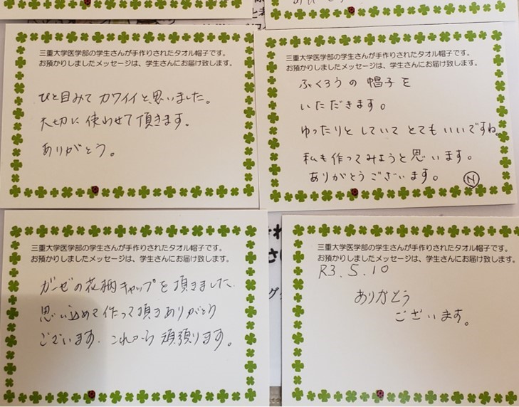 3月にも14個をお届けしており、学生からお届けした手作りタオル帽子は計27個になりました。患者さんからの評判も上々とのことです。