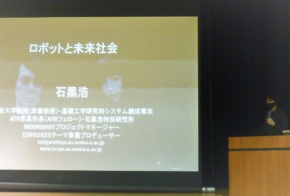 第2部は、前半に大阪大学大学院基礎工学研究科の石黒浩教授による基調講演「ロボットと未来社会」が行われ、教育分野を含む社会全体でのロボット活用の可能性についてお話をいただきました。後半は、石黒教授と附属小学校5、6年生の子どもたち7名との対話が行われました。子どもたちからの石黒教授への「ロボットと人間の違いは何か」「ロボットがめざすものは何か」「ロボットは、自己複製ができないのではないか。」「ロボットには欲望がない。それが人間との違いではないか。」といった質問に対して、石黒教授から丁寧な説明があり、参加した子どもたちにとっても貴重な体験となりました。