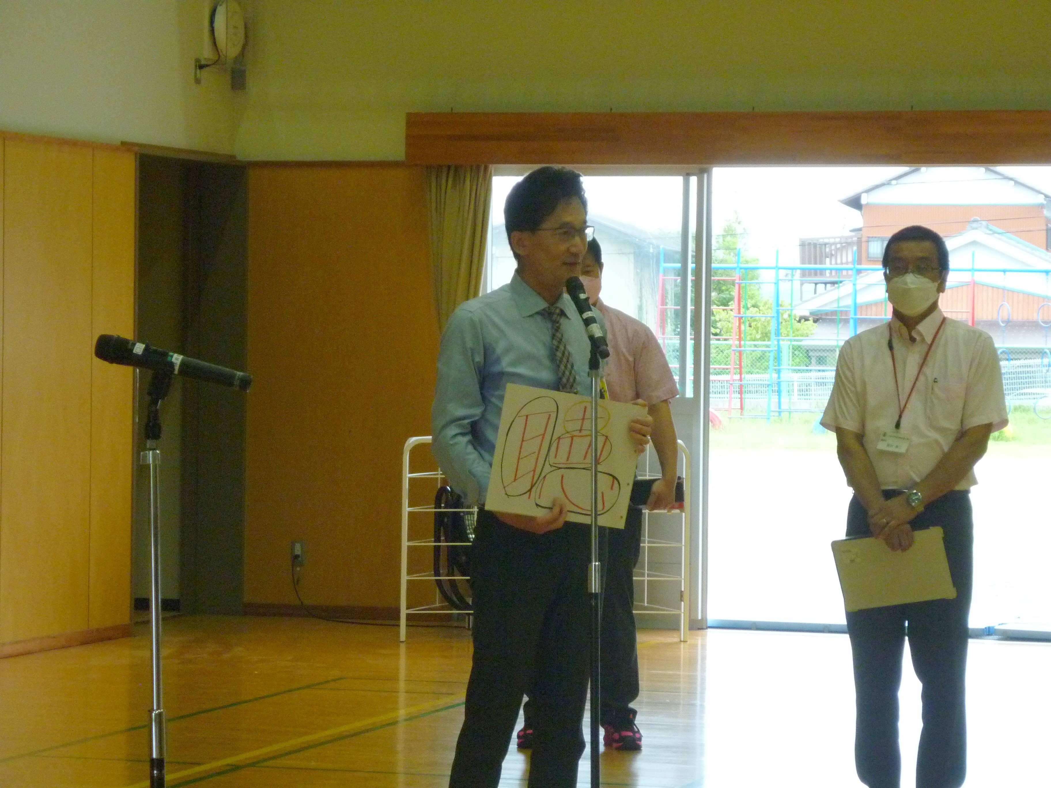松浦校長からは、小学校の3つの取り組み①あいさつ②黙言清掃③聴くについてお話があり、「あいさつは心のプレゼントです。この精神を忘れないでください。目と目で話すことでコミュニケーションを取り、相手を思いやって清掃しましょう。耳と目、心と体全体で話を最後まで聴きましょう。子どもたちが取り組んでいることです。先生達も一緒にお願いします。」と挨拶されました。
