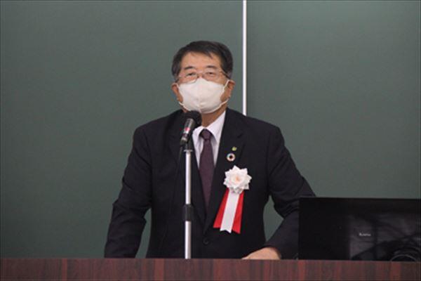 続いて、松村直人研究科長から、式典の趣旨、研究科で取り組んでいる100周年記念事業の概要、高等農林の歴史、農学の高等教育、農学部や水産学部を統合して生物資源学部となって35年が経過したこと、「生物資源」という言葉を初めて学部名に冠した大学であること、農場・演習林・水産実験所・練習船勢水丸・鯨類研究センターなどを有し、2022年は「紀伊・黒潮生命地域フィールドサイエンスセンター」発足20周年の記念の年になること、全国農学系学部長会議による「農学憲章」からの引用として、農学の理念と農学の定義が述べられました。そして、「生物と環境から構成される地球システムは、食料・環境・エネルギーなど、持続可能な社会を構築していく上で多くの喫緊の課題を抱えており、農学が果たす役割はますます大きくなっていることから、山の頂きから海の底まで、さらに大気圏や気象分野までを対象領域に、広く社会との連携を深め、既存の枠にとどまることなく、農学に関する教育研究の振興のため、「チーム生物資源」が一丸となって人類福祉の向上に貢献していくことが次の100年に向けた使命であると確信し、有為な人材を育てていきたい」と述べて式辞を締めくくられました。