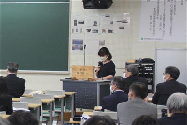 最初に、松村直人100周年記念事業実行委員長から、ロゴの応募状況や選考経過について説明があったあと、共生環境学科4年・加藤沙耶香さん制作のロゴを最優秀賞として決定した旨の発表がありました。発表のあと、表彰状と副賞の授与が行われ、加藤さんから、ロゴの制作への思いを語っていただきました。