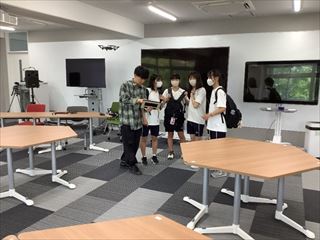 午前中は、キャンパス内の施設見学がメインであり、情報ライブラリーセンター(図書館)、数理・データサイエンス館、三翠会館の3つの施設を見学しました。情報ライブラリーセンター(図書館)では、大学の職員が館内を説明し、生徒たちは蔵書数の多さを興味深そうに見ていました。数理・データサイエンス館では、ドローンを操作したり、VR体験をしたり、3Dプリンターなどの機器に触れたり、三翠会館では、展示されているパネル写真や資料などから三重大学の歴史を知ることができました。
