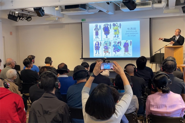 8月21日(月)、ジャパンハウスで山田雄司・人文学部教授、吉丸雄哉・人文学部教授、川上仁一・産学官連携コーディネーターが忍者に関する講演・実演を行いました。Carlos Augusto Rozaジャパンハウスサンパウロ副館長、一見勝之三重県知事の挨拶の後、同時通訳によって講演が行われ、約60名の皆さんに、熱心に聴いていただきました。