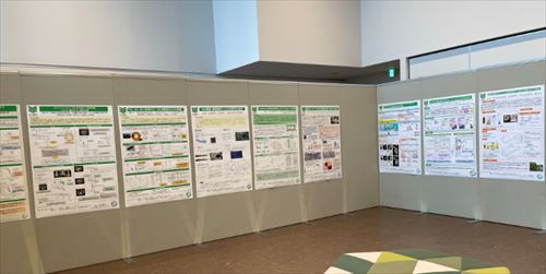 初開催となった今回は、大学院生物資源学研究科の学生・教員による「地域課題への対応」を共通テーマとした研究発表のパネル21枚と、同研究科の社会連携活動やフードシステム研究などの概要を紹介するパネル3枚が展示されました。会場の交流展示室には、社会人のほか親子連れも多く、また団体見学で博物館を訪れた中高生が熱心にパネルを見つめる姿も見られました。