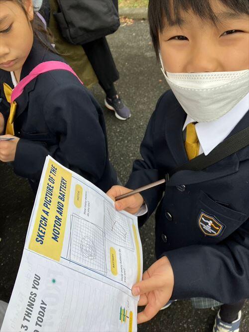 その後、地域イノベーション研究開発拠点に移動し、本学公認サークルである電気自動車研究会が保有する電気自動車の見学をしました。榊原謙 部長(工学研究科電気電子工学専攻修士課程2年)を含む3名の部員が、実際の電気自動車の構造を英語で解説しました。児童らは、解説を聞きながらバッテリやモータの構造を熱心に写し取っていました。また、安全面に細心の注意を払った上で、数名の児童が電気自動車の試乗をしました。