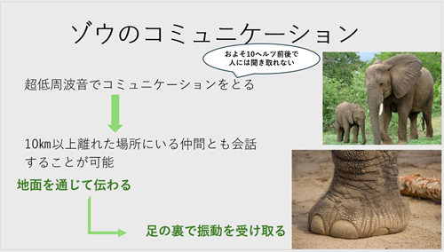 木曜日のクラスは、「ゾウの足跡」と題して、ゾウの生態系エンジニアとしての役割や、ゾウの生態やコミュニケーション、脳の大きさ、足跡化石などいろいろな話題に言及しました。コメンテーターとして、群馬サファリパーク顧問・獣医師の川上茂久先生に参加いただきました。ゾウの脚がコミュニケーション以外にも敏感で、地震波も瞬時に感じること、ゾウに豆を食べさせてつくるブラック・アイボリー・コーヒーの話、動物園での繁殖時のオスメスの相性、人工授精による繁殖のことなど、いろいろなお話を聞かせていただき、学生からも多くの質問が出て盛り上がりました。