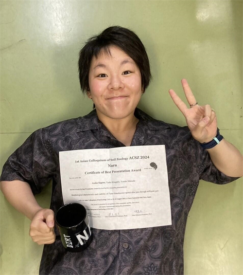 8月22日(木)~24日(土)に、奈良県奈良市にて、The first Asian Colloquium of Soil Zoology(ACSZ 2024、第1回アジア土壌動物学会)が開催され、生物資源学研究科 資源循環学専攻 森林資源環境学講座 森林微生物学研究室 博士前期課程2年生の瀬川あすかさん(担当教員:松田陽介教授、北上雄大助教))が優秀発表賞(Winners of the Best Presentation Award(BPA))を受賞しました。