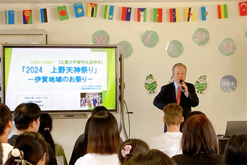 講師に上野商工会議所副会頭の中井茂平氏と(株)まちづくり伊賀上野業務部長の山﨑祐子氏を招き、当日参加する留学生が上野天神祭の魅力をはじめ、神輿、鬼行列、楼車(ダンジリ)の構成で町中を歩く説明を受けました。
