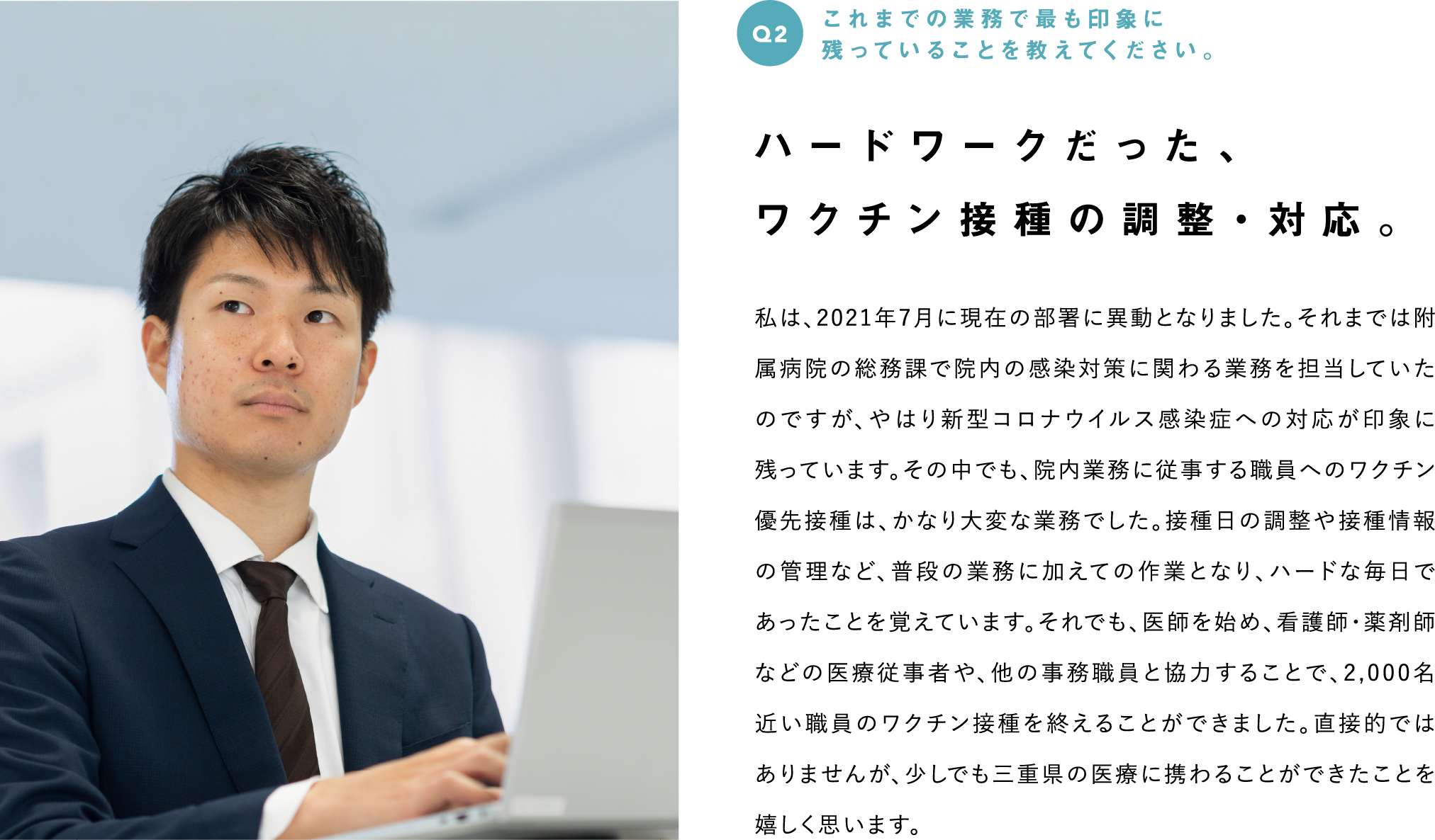 Q2 これまでの業務で最も印象に残っていることを教えてください。--ハードワークだった、ワクチン接種の調整・対応。 Q2 これまでの業務で最も印象に残っていることを教えてください。--ハードワークだった、ワクチン接種の調整・対応。