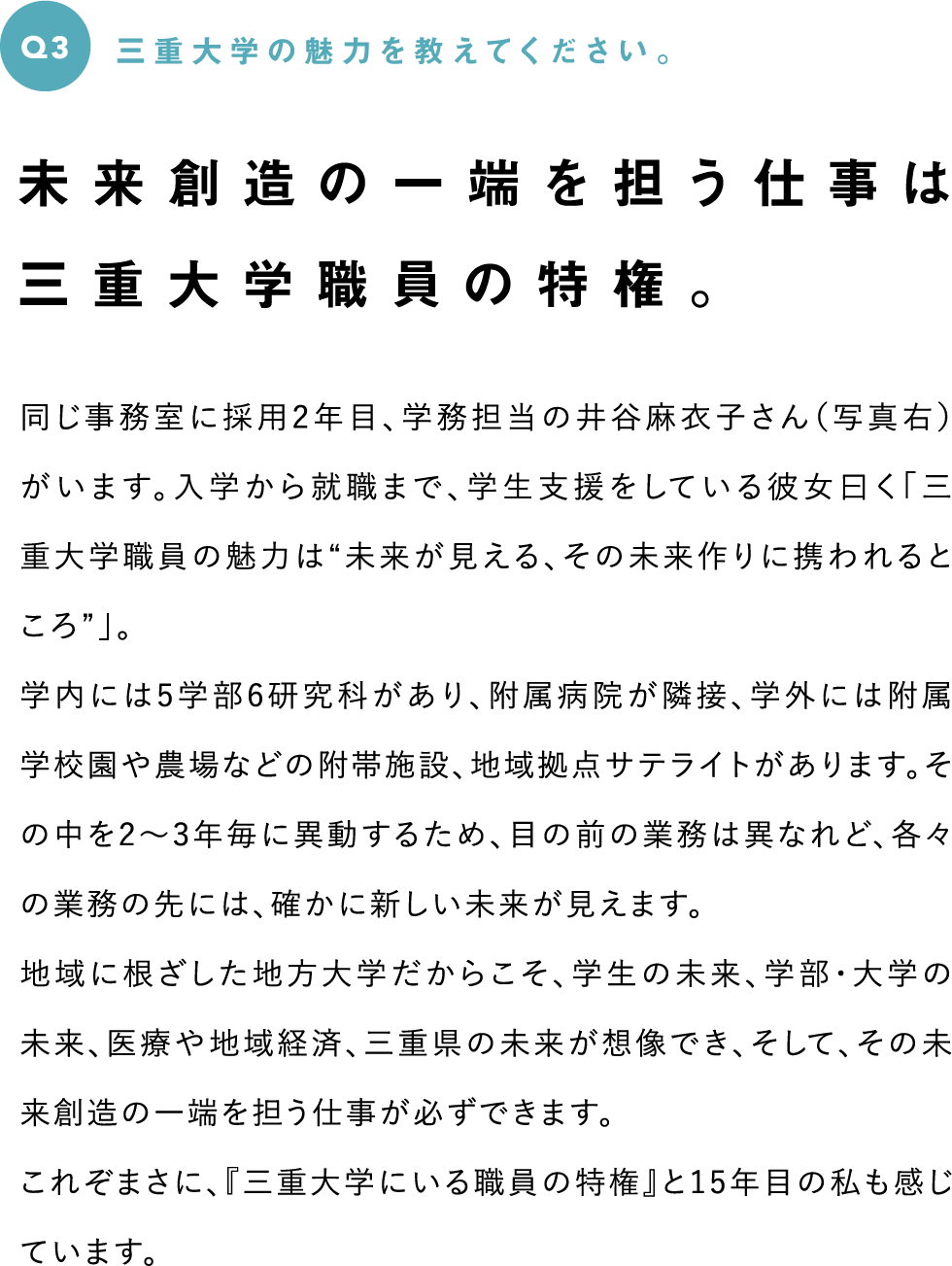 Q3 三重大学の魅力を教えてください。--未来創造の一端を担う仕事は三重大学職員の特権。 Q3 三重大学の魅力を教えてください。--未来創造の一端を担う仕事は三重大学職員の特権。