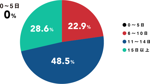 ●0〜5日 0% ●6〜10日 22.9% ●11〜14日 48.5% ●15日以上 28.6% ●0〜5日 0% ●6〜10日 22.9% ●11〜14日 48.5% ●15日以上 28.6%
