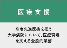 地域連携 地域の企業や自治体等と連携し、戦略的にプロジェクトを企画・支援する業務 医療支援 高度先進医療を担う大学病院において、医療現場を支える全般的業務