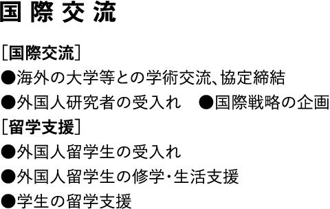 国際交流 [国際交流]●海外の大学等との学術交流、協定締結●外国人研究者の受入れ ●国際戦略の企画 [留学支援]●外国人留学生の受入れ ●外国人留学生の修学・生活支援●学生の留学支援国際交流 [国際交流]●海外の大学等との学術交流、協定締結●外国人研究者の受入れ ●国際戦略の企画 [留学支援]●外国人留学生の受入れ ●外国人留学生の修学・生活支援●学生の留学支援