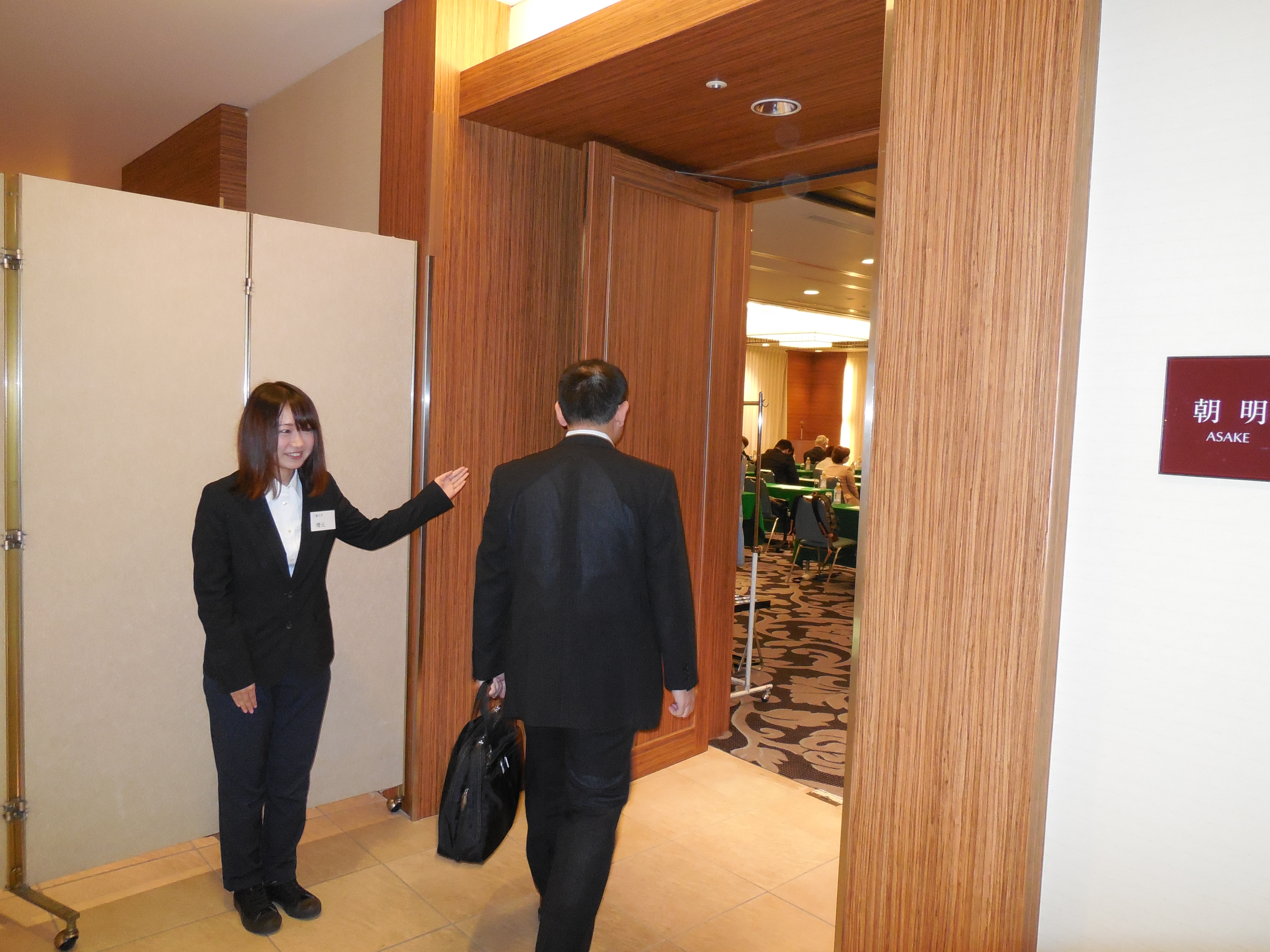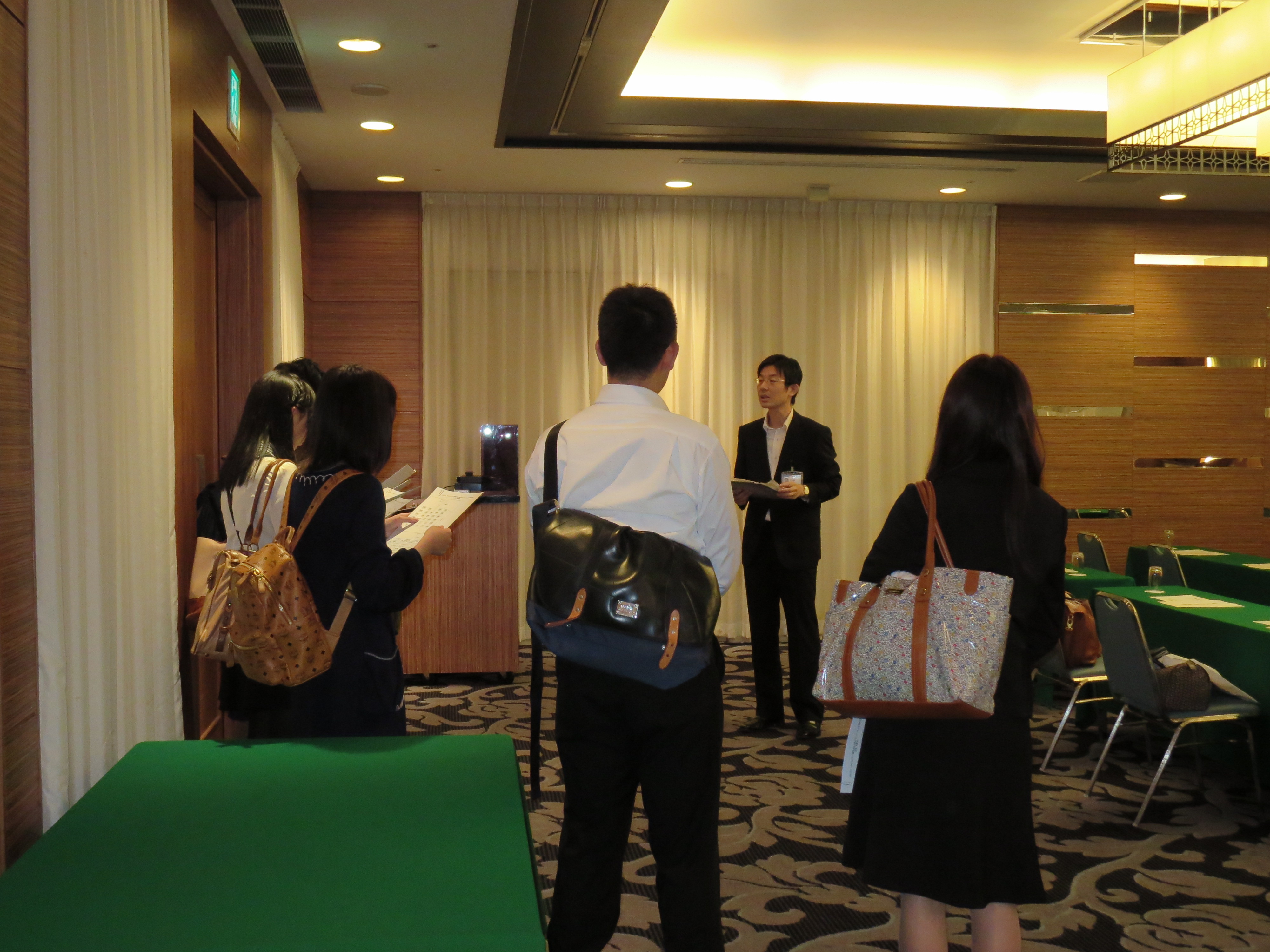 始めに、三重銀総研の担当の方より、接客のマナー、業務分担について説明を受け、受付、会場出入口でのセミ ナー受講者に対する案内、講師対応の業務をグループに分かれて行いました。セミナーを受講した後は、セミナー受講者の方の見送り、アンケート回収の業務に携わらせていただきました。